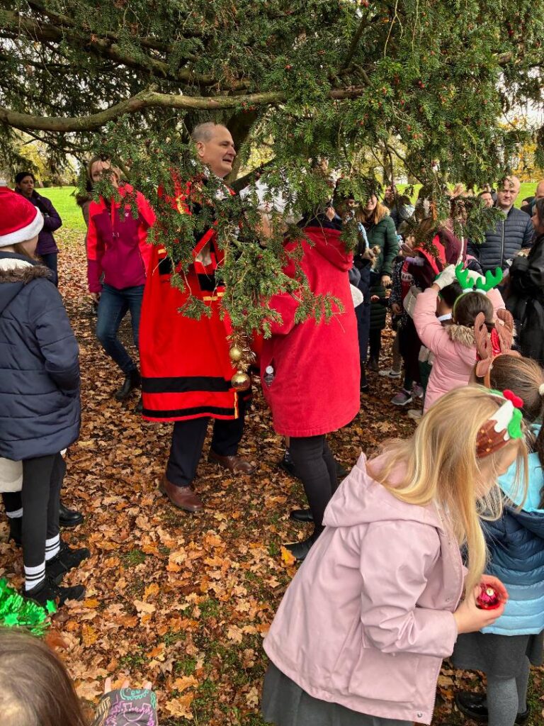 Eastcote House Garden Tree Dressing 2025 December 8, 2025 RogerW Lion Lynne enjoying the rain at the recent tree dressing event Never mind, Lynne – the mayor got wet as well!